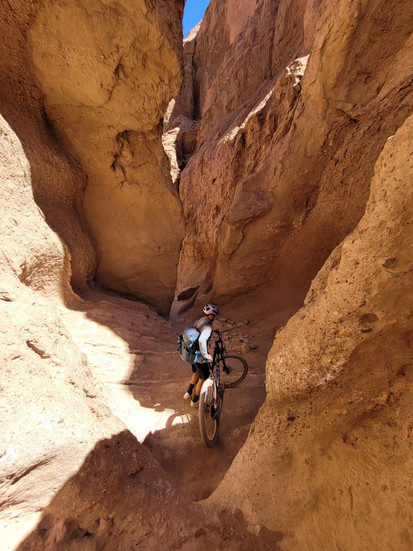 Auch an Tag zwei machen wir die Atacama Wüste mit dem Fahrrad unsicher. Mit schmerzenden Popos geht es in den Garganta del Diabolo - den Rachen des Teufels. Wie so richtige, coole Mountainbiker:innen fahren wir ab und zu auch im Stehen oder rasen 30 cm hohe Erhöhungen rauf und runter. Der Canyon schlängelt sich rot durch die Felsen, nach dem fünfminütigen Aufstieg zu Fuß am Ende des Weges eröffnet sich uns ein krönendes Ende: Ein 360 Grad Blick auf die Umgebung, welche australische und auch kappadokische Elemente innehat. Wunderschön!