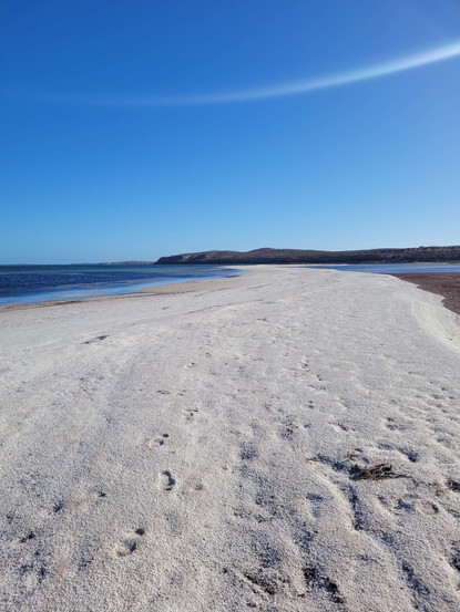 Die erste Fahrt macht schon einen riesigen Spaß. Wir werden alle durchgeruckelt, bzw. bekommen die sogenannte "Shark Bay Massage", wie unsere geübte und großartige Fahrerin es nennt. Wir fahren vorbei an unzähligen Salzseen, auf denen Sand Fire wächst, welches die Aborigines oft zum Kochen verwendet haben, da es eine salzige Note hat. Bec meint, das müssen wir probieren, also steigen wir alle aus und verköstigen zwei Arten Sand Fire - salzig und lecker!