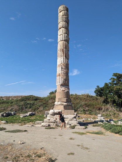 Da wir gerade bei Ruinen sind. Im nächsten Ort Selcuk, haben wir die Möglichkeit, eines der sieben antiken Weltwunder zu besuchen: Den Tempel der Artemis. Viel davon steht nicht mehr, genauer gesagt eine Säule, die im letzten Jahrhundert rekonstruiert wurden. Die Tatsache, dass es eines von wenig "verbliebenen" antiken Weltwundern ist, reicht für ein Stäunchen jedoch aus.