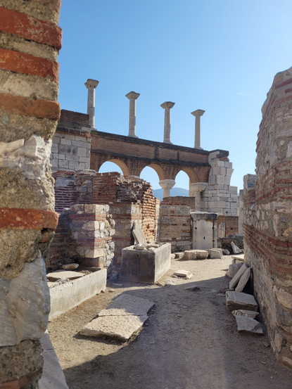 Von Selcuk aus besuchen wir natürlich auch die weltberühmten Ruinen von Ephesos. Um den Massen voraus zu sein, starten wir auch hier früh und merken bei Ankunft, dass wir, statt am Haupteingang, am Ausgang hinein gehen. Wir bemerken außerdem mit etwas Ärgernis im Bauch die sieben Reisebusse, welche hier ankommen - doch komischerweise leer?! Uns geht schnell ein Licht auf, die Busse haben ihre 350 Insassen wohl am Haupteingang abgeliefert, um sie dann hier wieder aufzugabeln. Das spielt uns voll in die Karten, denn die erste Hälfte und damit auch die Hauptattraktion der Ruinen, die Celsus Bibliothek, haben wir für zwei Minuten für uns, bevor eine sich schon bedrohlich nähernde Gruppe von bestimmt 200 der 350 Amerikaner:innen ankommt. Also alles richtig gemacht.