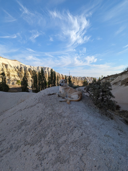 Nicht nur einmal merken wir sehr intensiv, dass die Tiere hier ein gutes Verhältnis zu Menschen haben. Zum Beispiel, als uns drei Hunde für eine Wanderung von 16 Kilometern über Stock und Stein begleiten. Ob sie an diesem Tag wirklich umziehen wollten oder klassische Pendler sind bleibt ungewiss. Oder als sich eine Katze wie selbstverständlich im Café neben Sonja auf den Stuhl quetscht und pennt. Oder als ein uns fremder Hund sich um 5 Uhr morgens bei Dunkelheit (leicht furchteinflößend, wenn 15 Meter vor dir in der Dunkelheit ein Hund sitzt, der sitzend, dir stehend, bis an den Bauchnabel reicht) so dermaßen freut uns zu sehen, dass er uns für die nächsten 8 Kilometer bei einer Wanderung begleiten wird und sich sogar, während wir den Sonnenaufgang ansehen, auch ein Plätzchen sucht und diesen ebenfalls genießt.