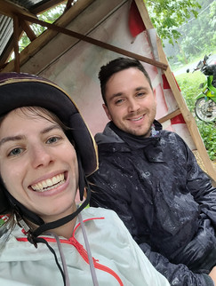 Was wir aufgrund der dunkelgrauen Wolken bereits erwarten, bewahrheitet sich innerhalb der ersten 15 Minuten, denn wir fahren mitten in einen heftigen Tropenregen hinein. Wir schmeißen uns die Regenjacken über, fahren nochmal 100 Meter, um dann zu beschließen, dass wir lieber Unterschlupf suchen und den Regen abwarten.